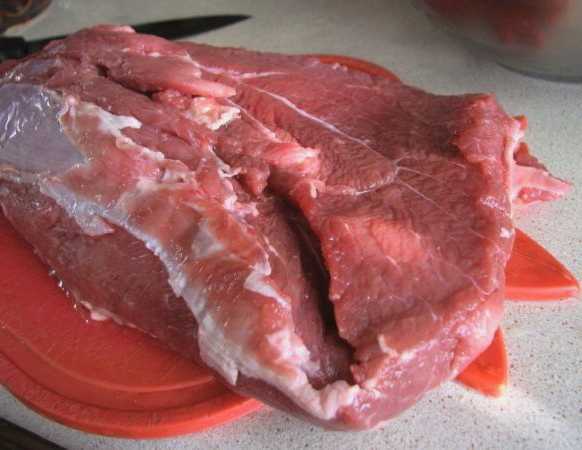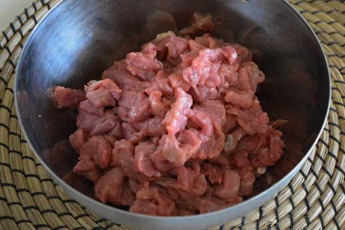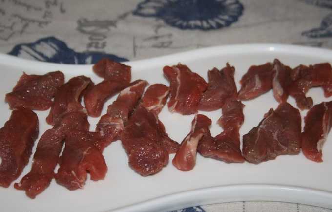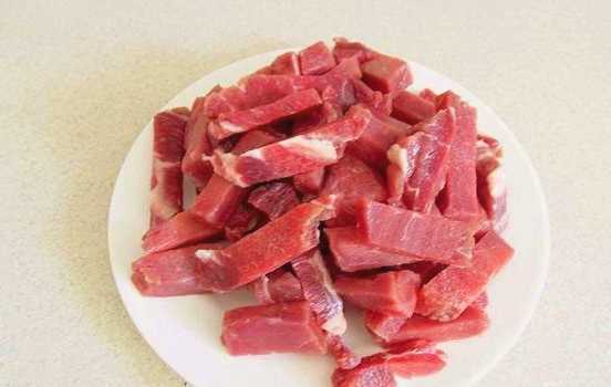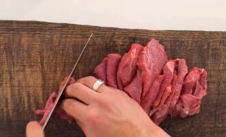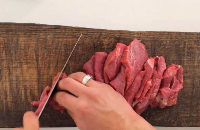 - Snijd het rundvlees in dunne reepjes. Het is belangrijk om dergelijk vlees tegen de vezels aan te snijden.