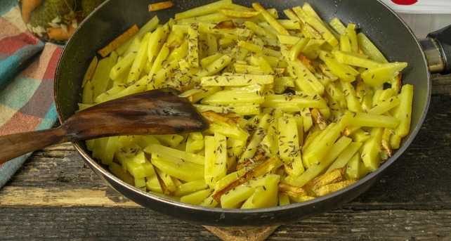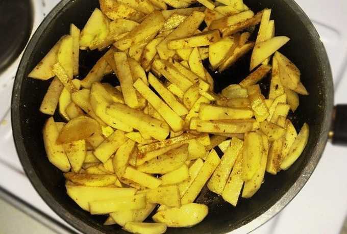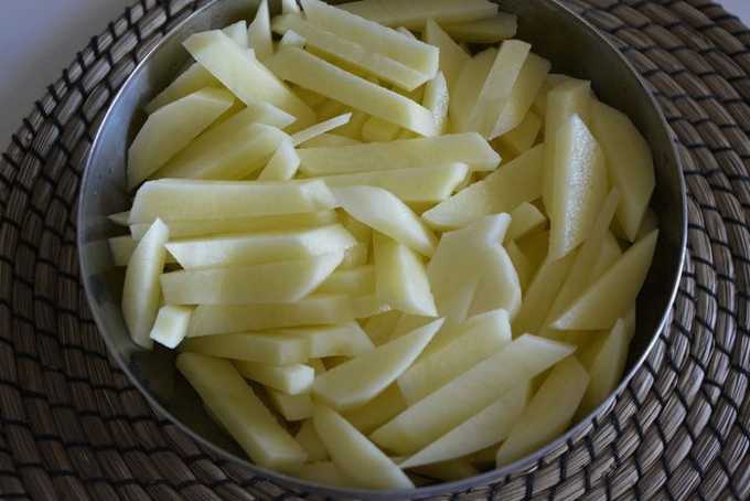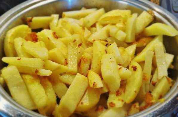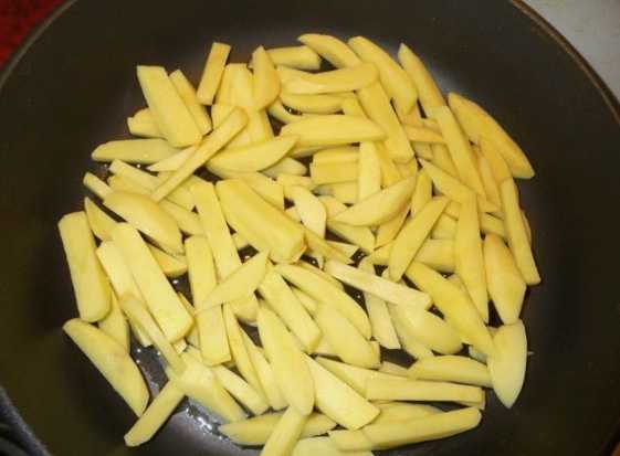- Schil de aardappelen en snij ze vervolgens in reepjes. We sturen om te bakken in een pan met plantaardige olie.