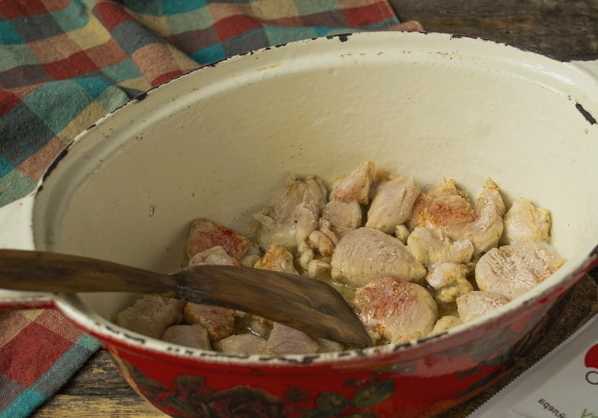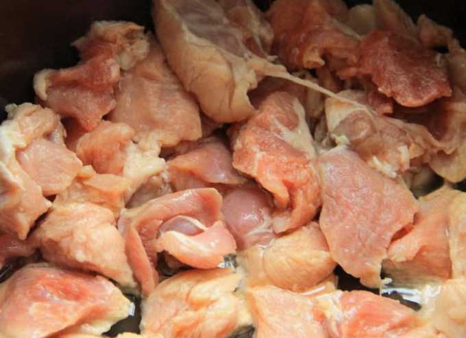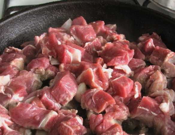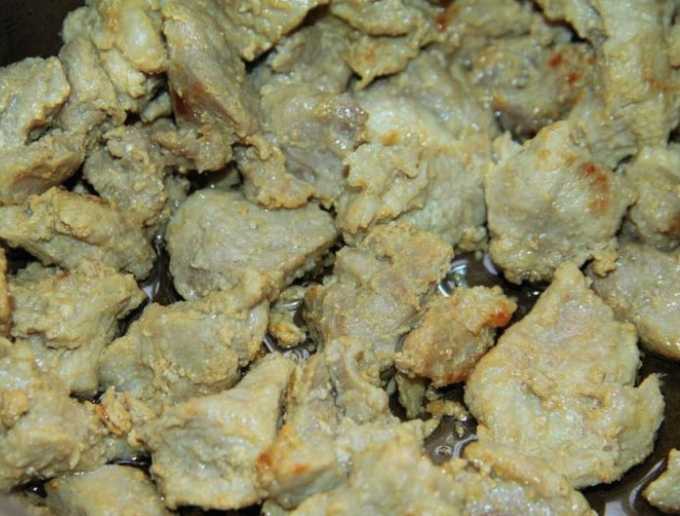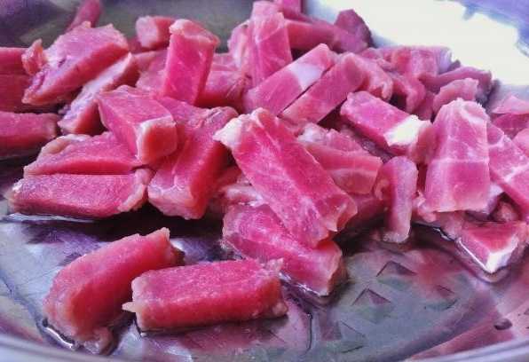 - Spoel het varkensvlees grondig onder water en snijd het in kleine stukjes. We sturen het vlees onmiddellijk op om in plantaardige olie te worden gebakken.