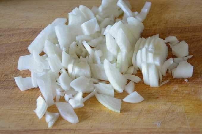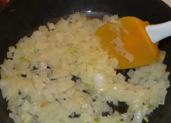 - Snijd de uien in kleine blokjes en bak ze apart tot ze transparant zijn gedurende 4-5 minuten.