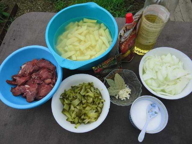 - We zullen alle producten voorbereiden. Snijd de aardappelen en het rundvlees in dunne reepjes. Hak de knoflook fijn. Hetzelfde doen we met augurken. De ui kan in dunne halve ringen worden verdeeld.
