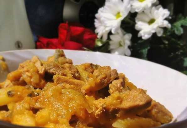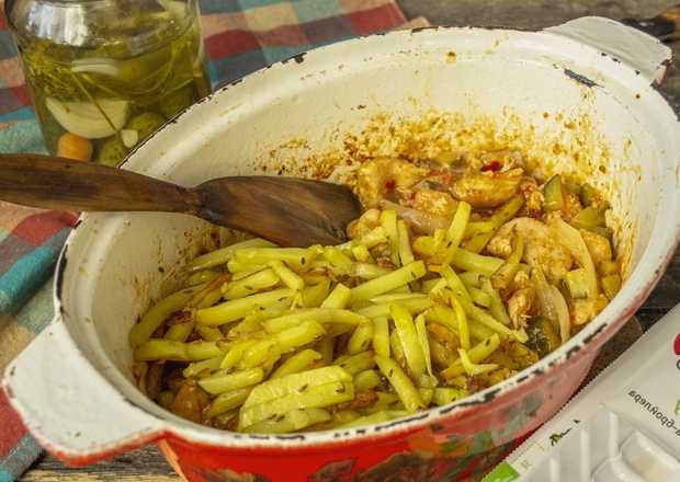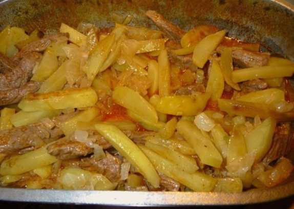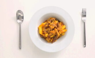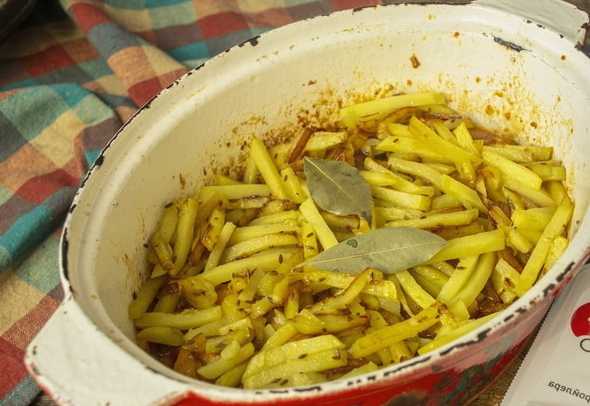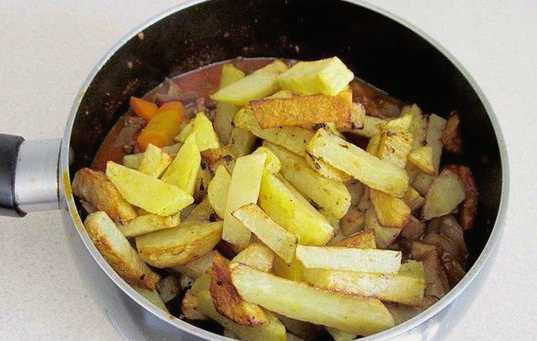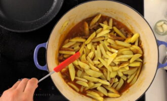 We maken de aardappelen schoon en snijden ze ook in dunne reepjes. Voeg het product toe aan het gerecht, vul het met een glas water en laat sudderen.