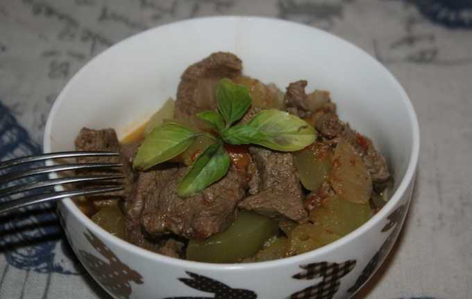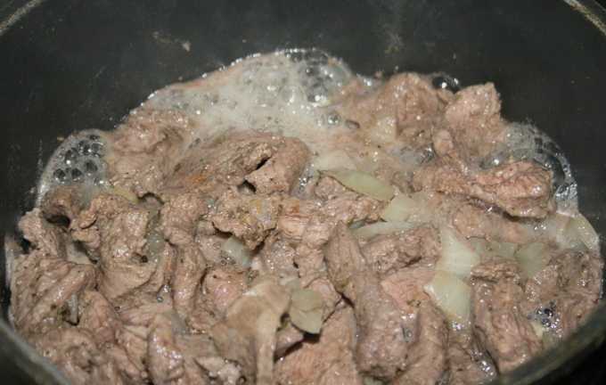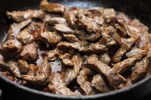 - Bak het rundvlees in plantaardige olie gedurende 20-25 minuten op middelhoog vuur. Niet