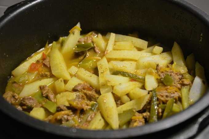 - We dompelen aardappelen in het gerecht. Zout, voeg kruiden toe. Roer en schakel de modus "Quenching" opnieuw in, maar gedurende 20-30 minuten.