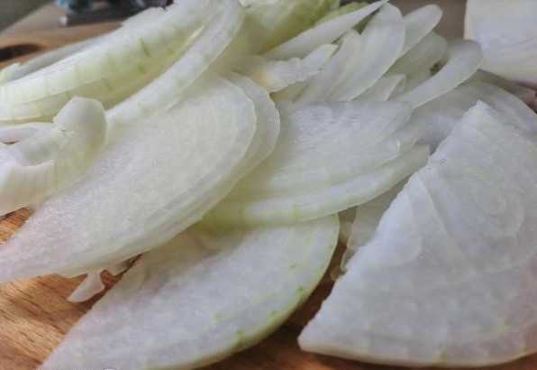 Pel de uien en snijd ze in dunne halve ringen.