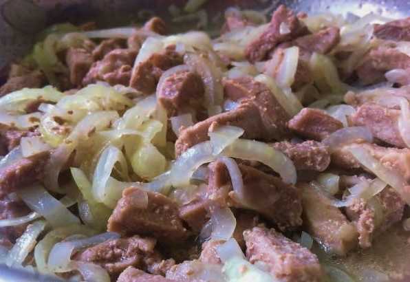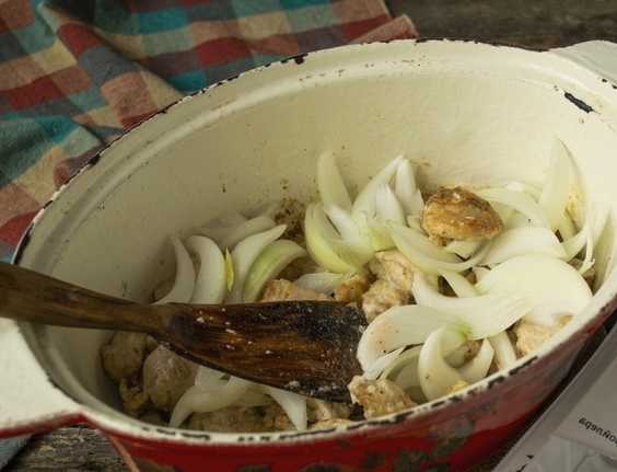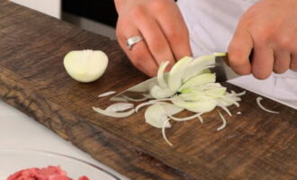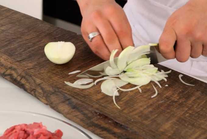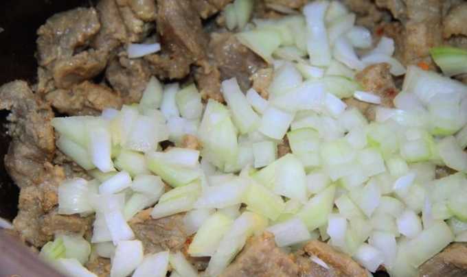 - Snijd de uien in dunne halve ringen, voeg ze toe aan het vlees en bak verder.