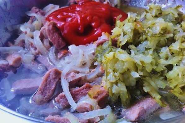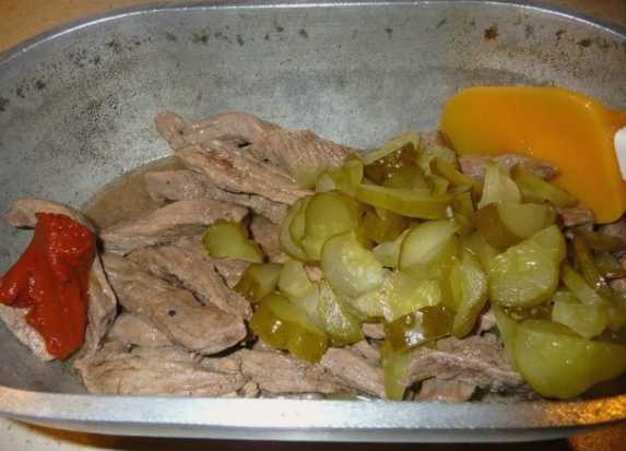 Haal ingemaakte komkommers door een rasp. Voeg ze samen met de uien toe aan het vlees. Kook tot een lichte blos verschijnt. Voeg vervolgens tomatenpuree toe en roer.