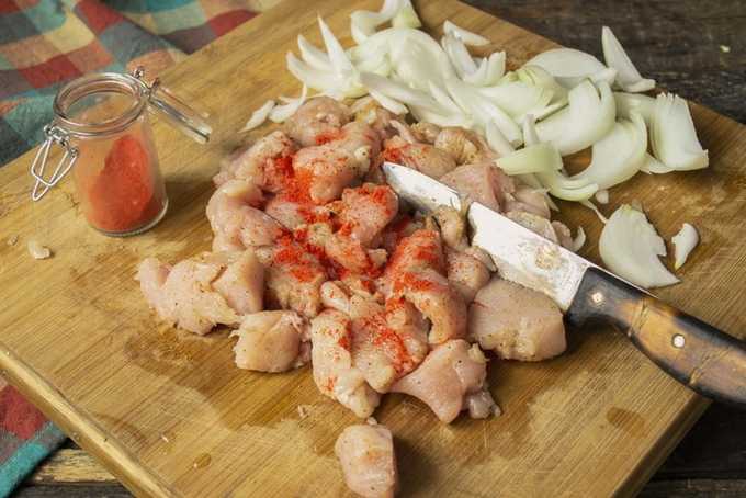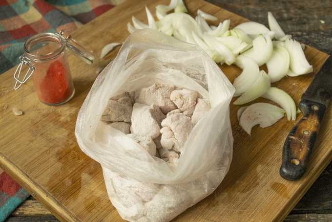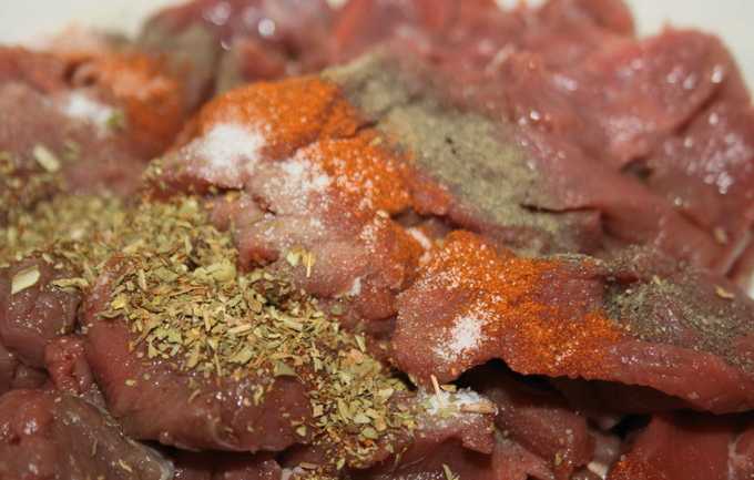 - Bestrooi het vlees met zout en kruiden. Roer grondig en marineer 20-40 minuten in de koelkast.