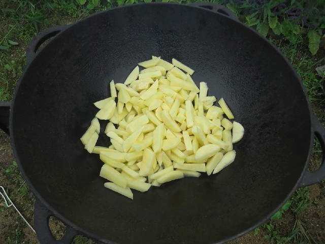 - Bak aardappelen in plantaardige olie in een ketel. We wachten op het verschijnen van een lichte blos.