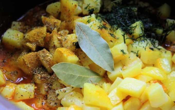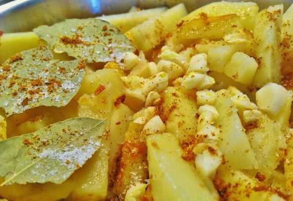 - Doe de gebakken aardappelen in een pan met vlees. Voeg hieraan zout, paprikapoeder, gehakte knoflook en laurierblaadjes toe.