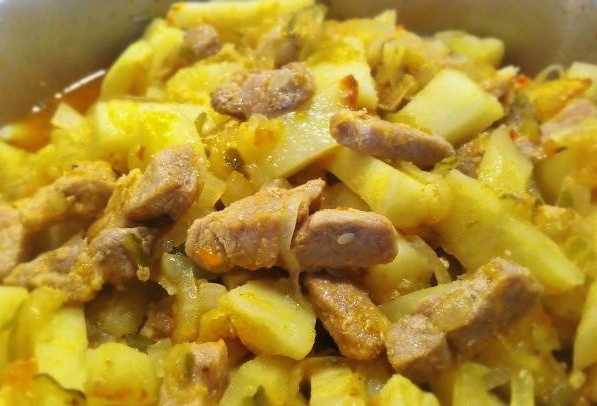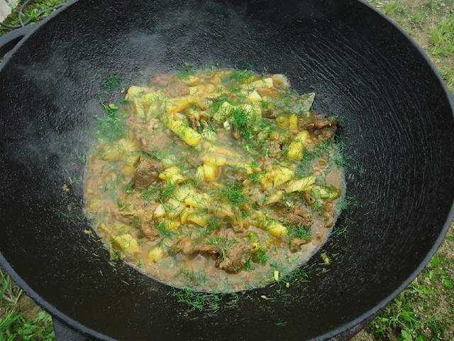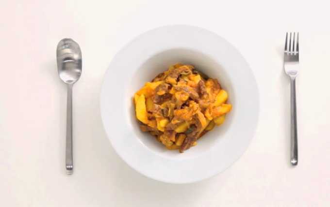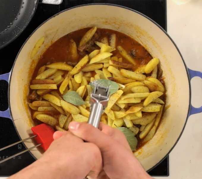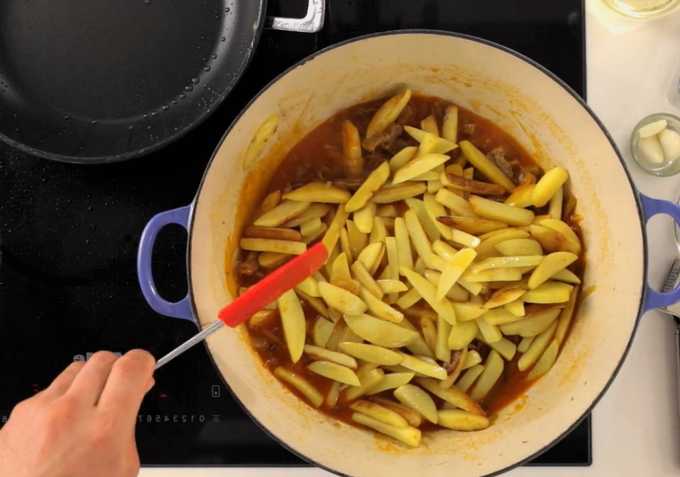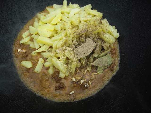 - Giet het vlees met een glas water. Ook aardappelen, gehakte kruiden en andere specerijen vervoeren we hier. Roer en laat 10-15 minuten sudderen.