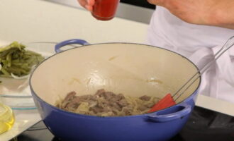 - Vul de inhoud met een glas water, verdeel de tomatenpuree. Roer en blijf sudderen.