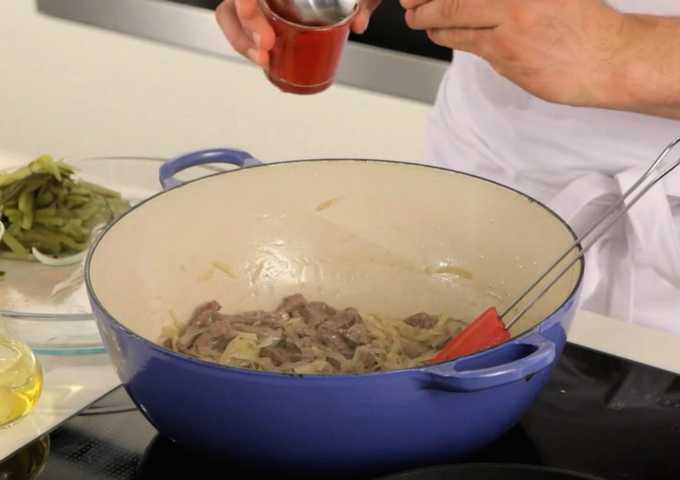 - Voeg nu tomatenpuree toe aan het gerecht. Zout, giet er water in, roer en laat nog 5 minuten sudderen.
