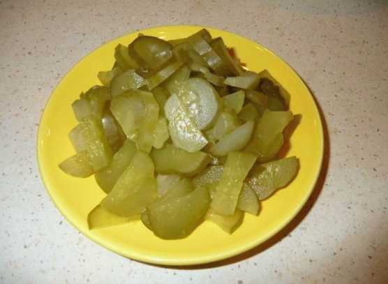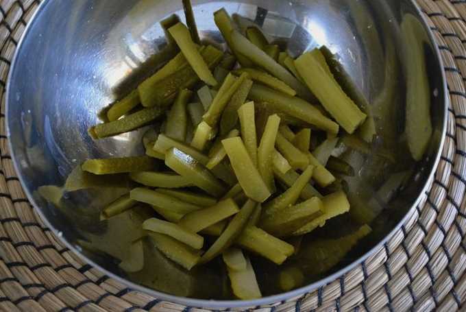 - Snijd ingelegde komkommers in reepjes.