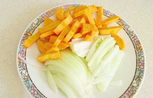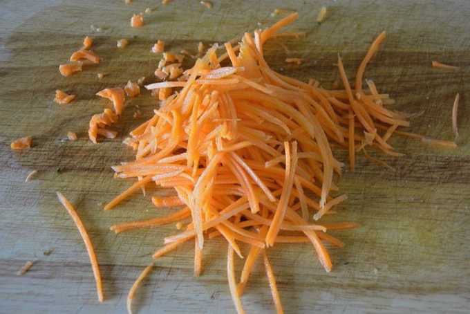 - Snijd vervolgens de ui in halve ringen. Wortelen - in kleine stukjes.