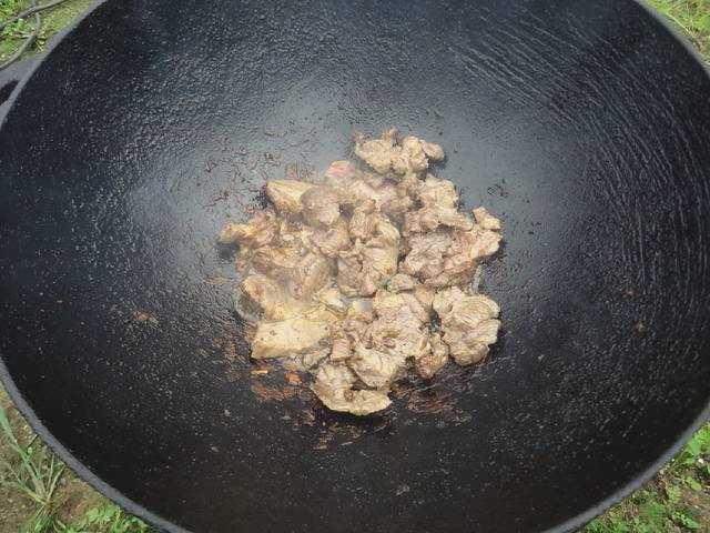- We spreiden de aardappelen een tijdje en nu bakken we het rundvlees in een ketel. 10-15 minuten.
