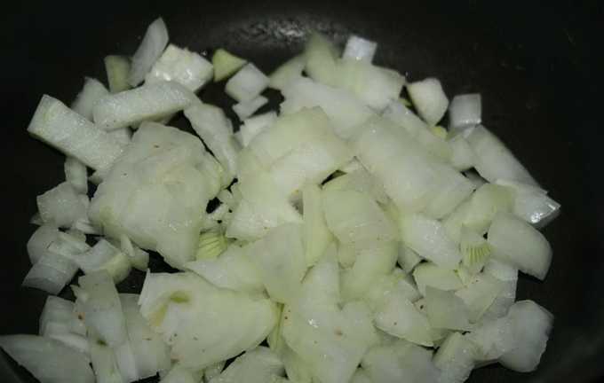 - Snijd de uienblokjes en bak ze in olie tot ze transparant zijn.