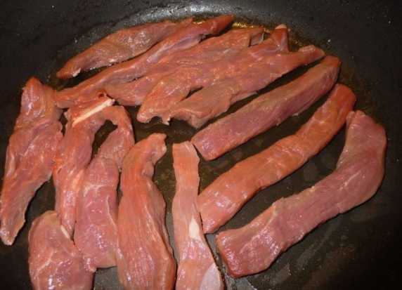 - Snijd het rundvlees in dunne reepjes en doe ze meteen in een met plantaardige olie ingevette koekenpan.
