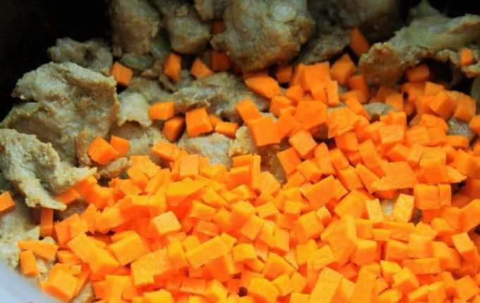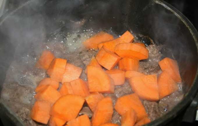 - Voeg wortelen toe aan het vlees en ga verder met koken.