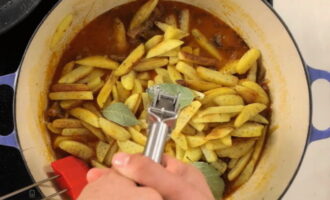 - Roer het gerecht, voeg laurierblaadjes toe en laat nog 10 minuten sudderen onder het deksel.