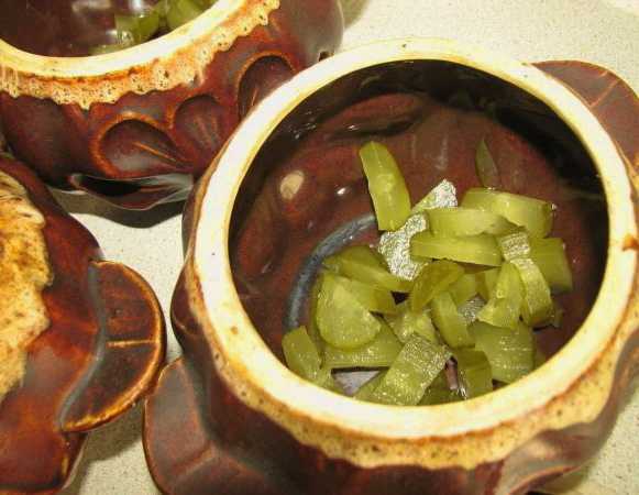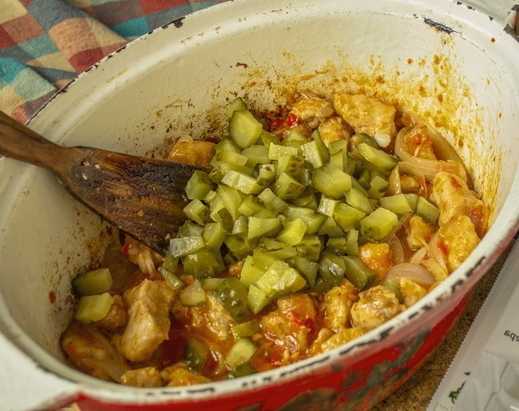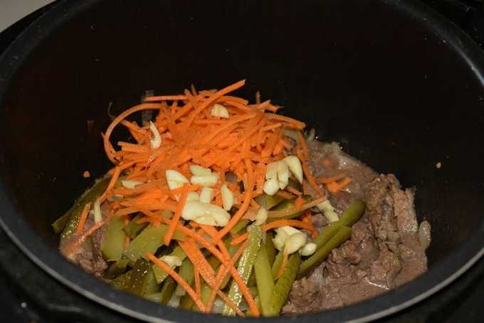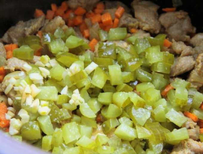 - Als de uien en wortelen zacht zijn, kunnen gehakte augurken en knoflook worden toegevoegd.