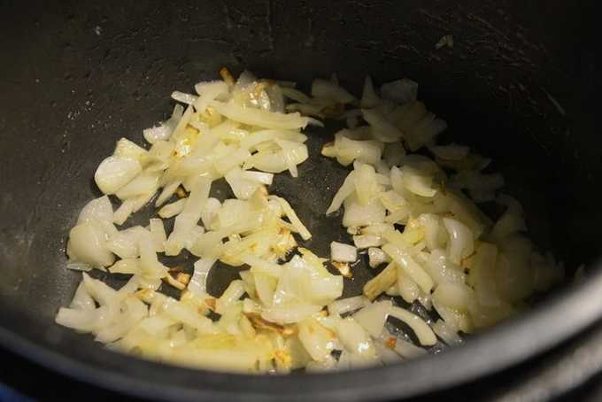 - We zetten de multicooker-modus "Frituren" aan. Voeg plantaardige olie toe aan de bodem van de kom en bak de ui daar 1-2 minuten.