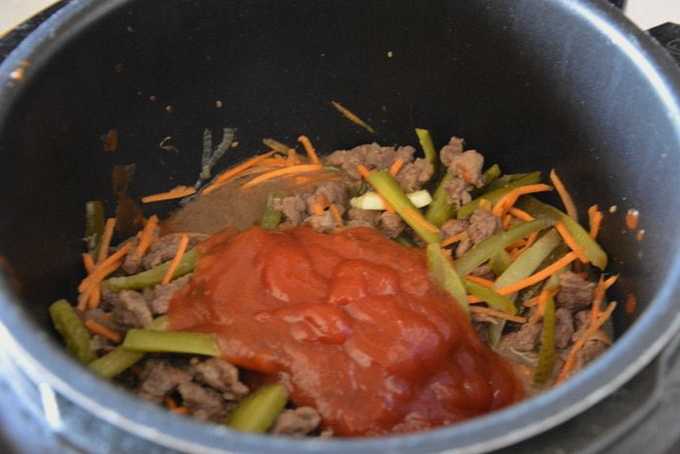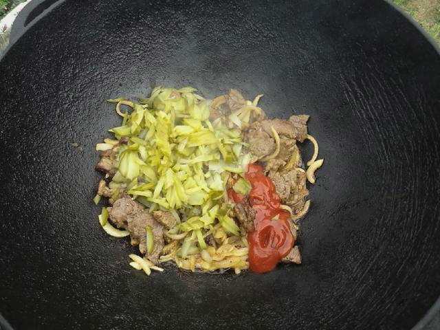 - Nu verspreiden we de augurken. Overgiet alles met tomatenpuree. Roer en laat de inhoud sudderen.