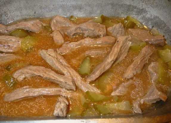 - Combineer rundvlees, komkommers en tomatenpuree in een ketel. We steken een klein vuurtje aan.