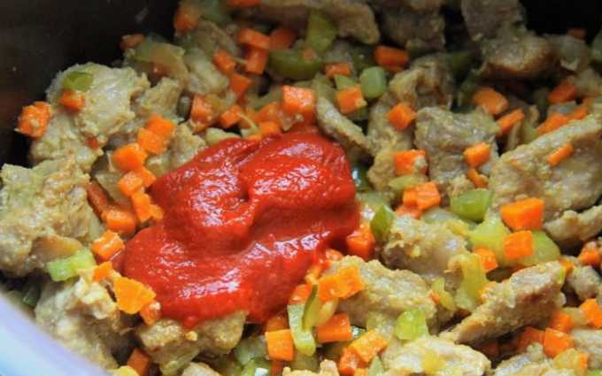 - Doe tomatenpuree op de producten, roer en laat op laag vuur een paar minuten sudderen.