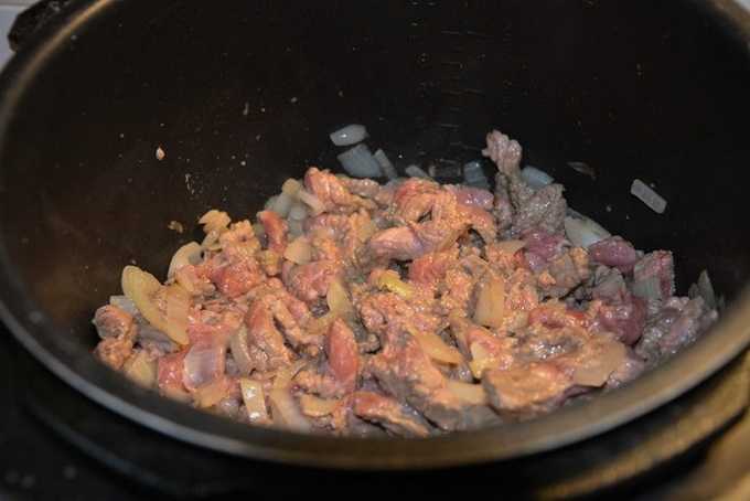 - Leg het vlees op de ui. Bak 3-5 minuten, sluit dan het deksel en stel de "Stew" -modus in op 20 minuten.