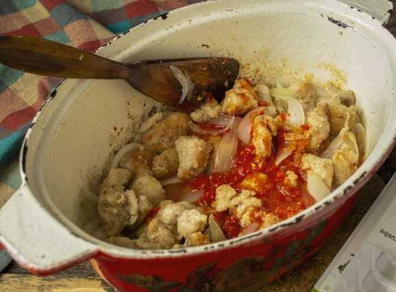 - Bak eerst het vlees en de uien in een pan. Kook ongeveer 25 minuten tot het product fel gekleurd is.