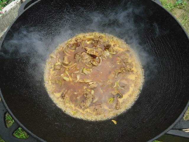- Vervolgens verspreiden we het vlees gemarineerd in kruiden naar de ui. Laat ongeveer 20 minuten sudderen.