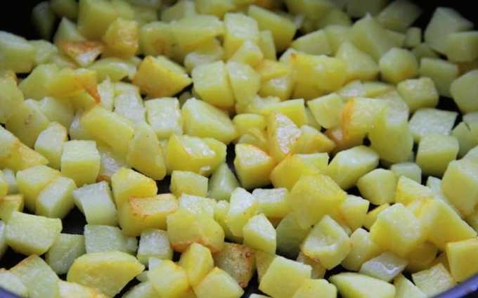 - We maken de aardappelen schoon en snijden ze in kleine stukjes. Bak het apart tot het gaar is.