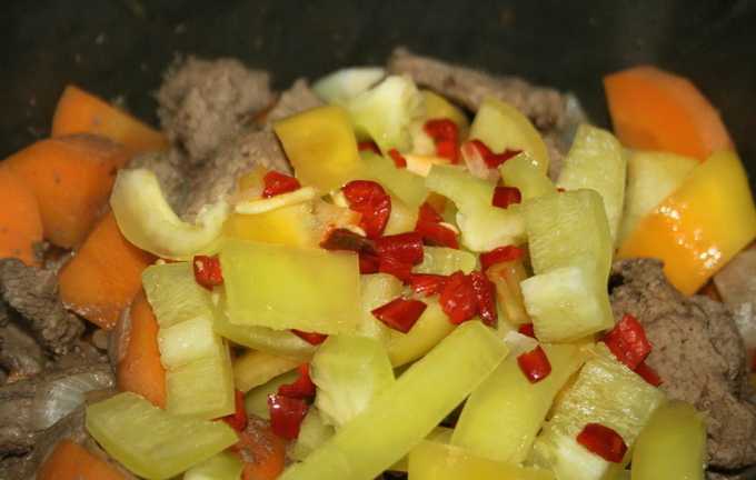 Spoel het vlees en snijd het in dunne reepjes. Het is belangrijk om het vlees tegen de vezels aan te snijden. Bak in een ketel in plantaardige olie.