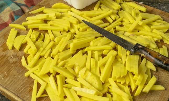 - We maken de aardappelen schoon en snijden ze in nette dunne reepjes.