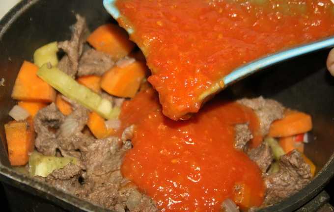 - Vul vervolgens het vlees met water. Voeg tomatenpuree, overige groenten, zout en kruiden toe aan het gerecht. Laat 20 minuten op laag vuur sudderen.