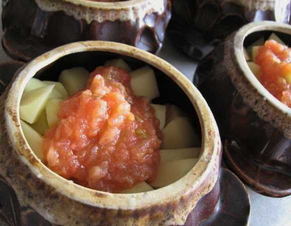- We maken de aardappelen schoon, snijden ze in kleine partjes of blokjes. Doe de groente in potten en giet de tomatenpuree erover. Giet 2-3 eetlepels water in elke portie.