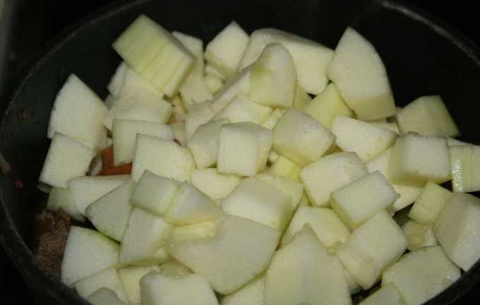- We maken de pompoen schoon, snijden ze in blokjes. Voeg toe aan de basis en laat het gerecht 20 minuten op laag vuur staan.