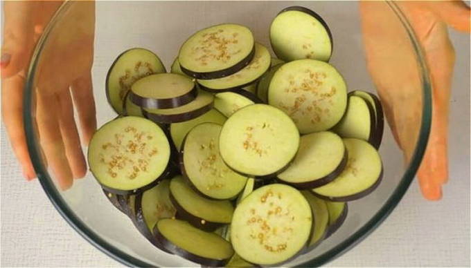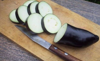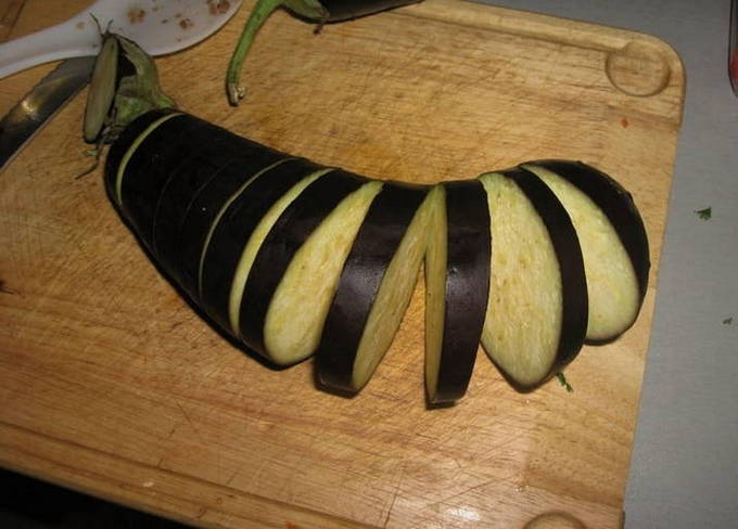 - Was de groenten en snijd ze overdwars in plakjes, zonder tot het einde te snijden, laat ongeveer 1 cm ongesneden. Leg de aubergines een half uur in gezouten water om de bitterheid te verwijderen.