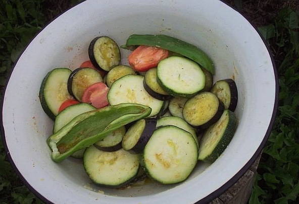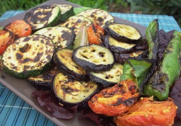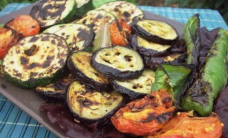 Aubergine past goed bij andere groenten. Als ze samen worden gegrild, zijn ze geïmpregneerd met elkaars smaken en vullen ze de smaak van vlees- of visgerechten aan. Het is belangrijk om de groenten voor het koken goed te laten marineren, dan zijn ze lekker mals.