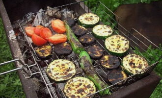Kook groenten op een rooster op houtskool zonder open vuur gedurende een paar minuten aan elke kant. Het is beter om de grill van tevoren in te vetten met plantaardige olie om het verwijderen van de afgewerkte gebakken aubergine gemakkelijker te maken.
