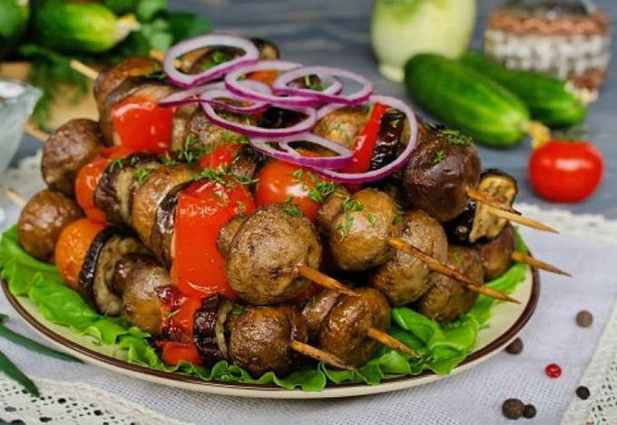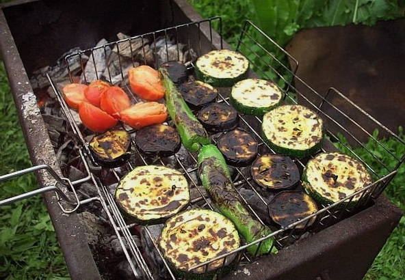 - Rijg afwisselend aan spiesjes champignons, plakjes paprika en aubergine, evenals tomaten. Grill de groentespiesjes ongeveer 10-15 minuten boven de houtskool en draai ze om zodat ze gelijkmatig gaar worden. Serveer op spiesjes met vlees of vis.