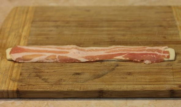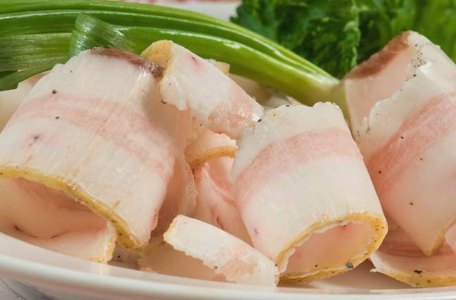 - Snijd het spek in dunne plakjes, breng op smaak met zout en chili en zwarte grond.
