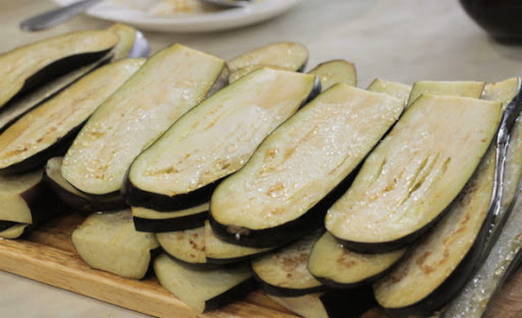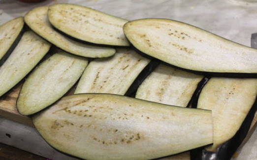- Aubergines wassen, stelen eraf snijden en in de lengte in dunne plakjes snijden.