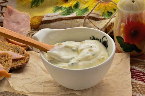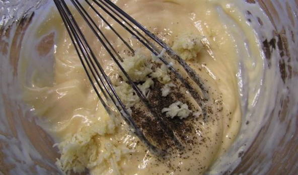 - Meng mayonaise, zout en fijngehakte knoflook in een bak.