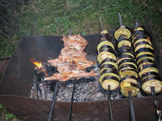 - Stukjes aubergine aan spiesjes geregen en ongeveer 15 minuten op houtskool koken, omdraaien zodat de groenten gelijkmatig gebakken zijn.