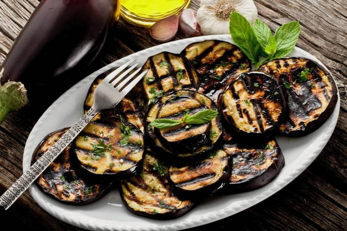 Een eenvoudig recept voor gegrilde groenten dat niet alleen geschikt is voor het koken van aubergines, maar ook voor courgettes, paprika's of tomaten. Olijfolie helpt ze te beschermen tegen aanbranden, terwijl knoflook en kruiden de groenten een aangenaam aroma geven.
