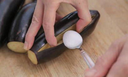 - Was de groenten en verwijder de steel. Snijd de aubergines in de lengte door, maak kruisvormige sneden in het vruchtvlees. Kruid met zout en besprenkel met citroensap.