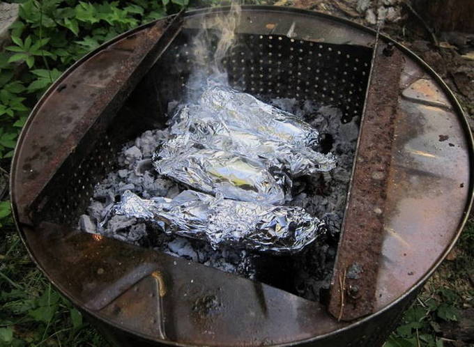 - Kook groenten met spek in folie op houtskool gedurende 40-45 minuten, af en toe draaien om niet te verbranden.