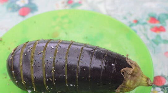 - Was de aubergines, snijd ze om de 1 cm in, maar snij ze niet helemaal door.